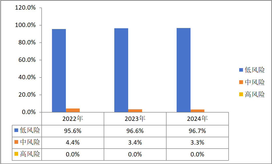 2024年,我公司高風(fēng)險供應(yīng)商0,中風(fēng)險供應(yīng)商占比為3.3%,低風(fēng)險供應(yīng)商占比為96.7%,中/高風(fēng)險供應(yīng)商審核率為100%。根據(jù)近三年供應(yīng)商風(fēng)險評估數(shù)據(jù)顯示,我公司低風(fēng)險等級供應(yīng)商數(shù)量占比呈現(xiàn)持續(xù)優(yōu)化態(tài)勢,供應(yīng)鏈風(fēng)險管理水平顯著提升。